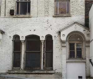 Number 8 Ashwin Street on the day following the 2008 fire – characteristic red brick banding, decorative stonework lintels and corbelled brickwork forming the eaves all feature. |